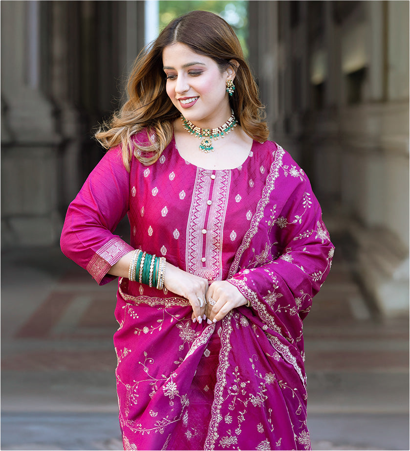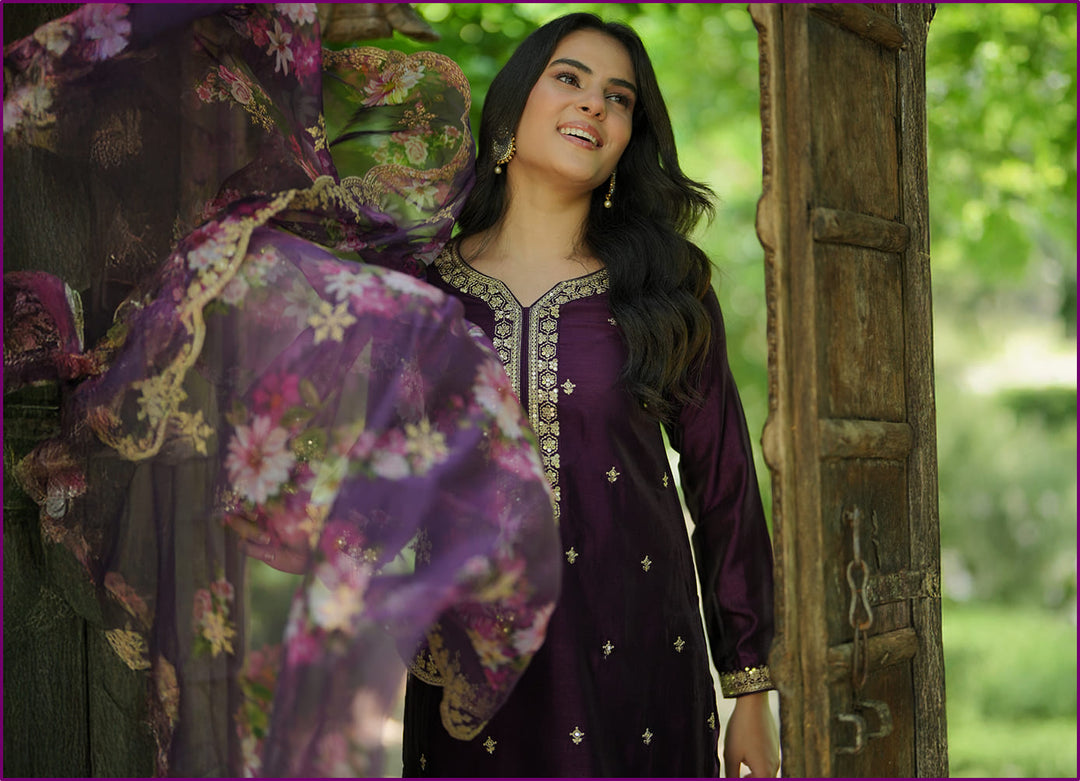 Adaa Wine Embroidered Silk Blend Straig...